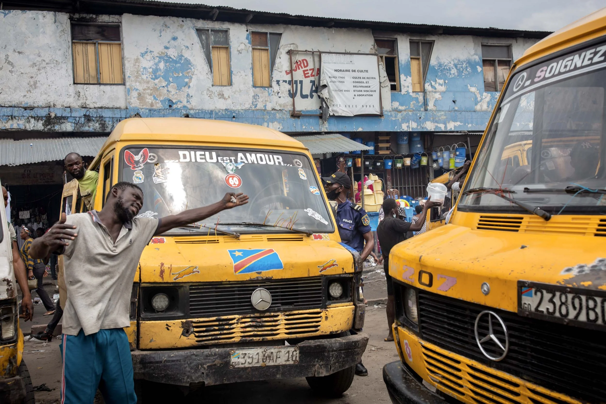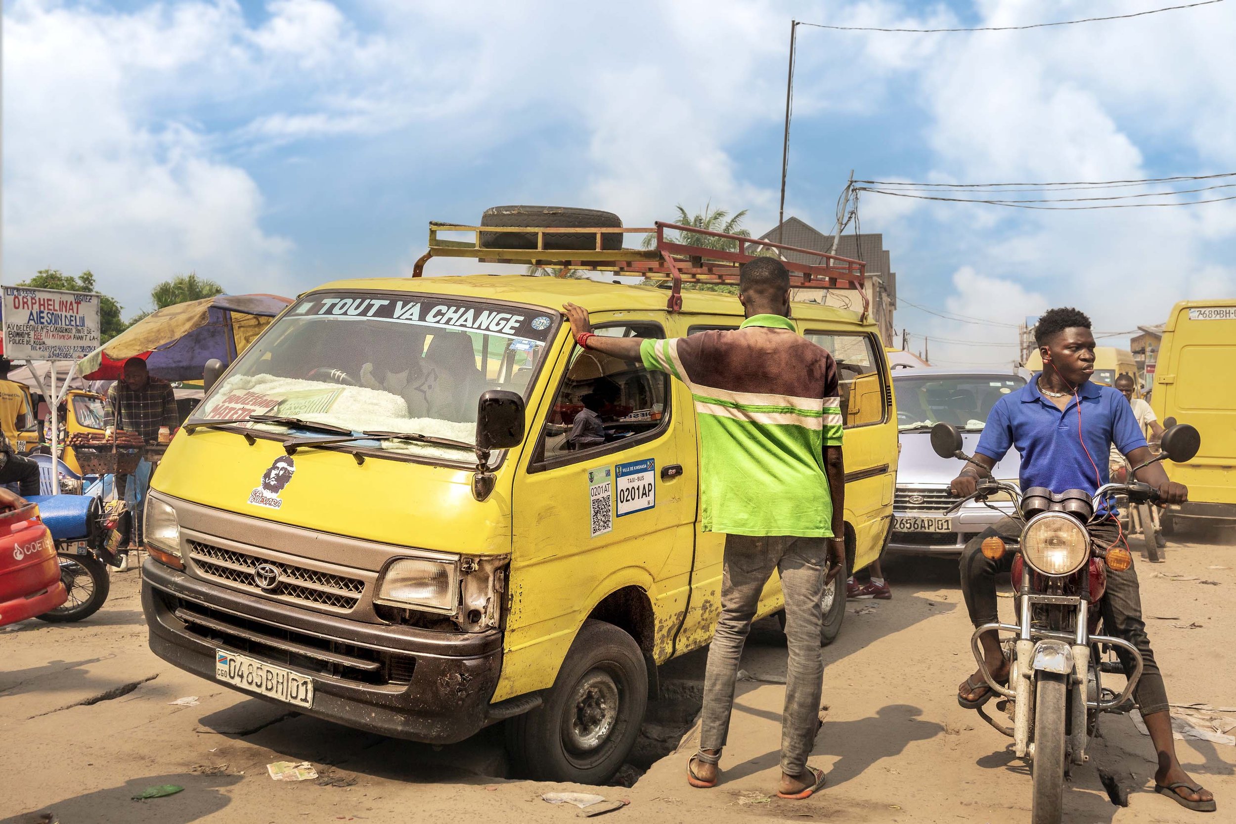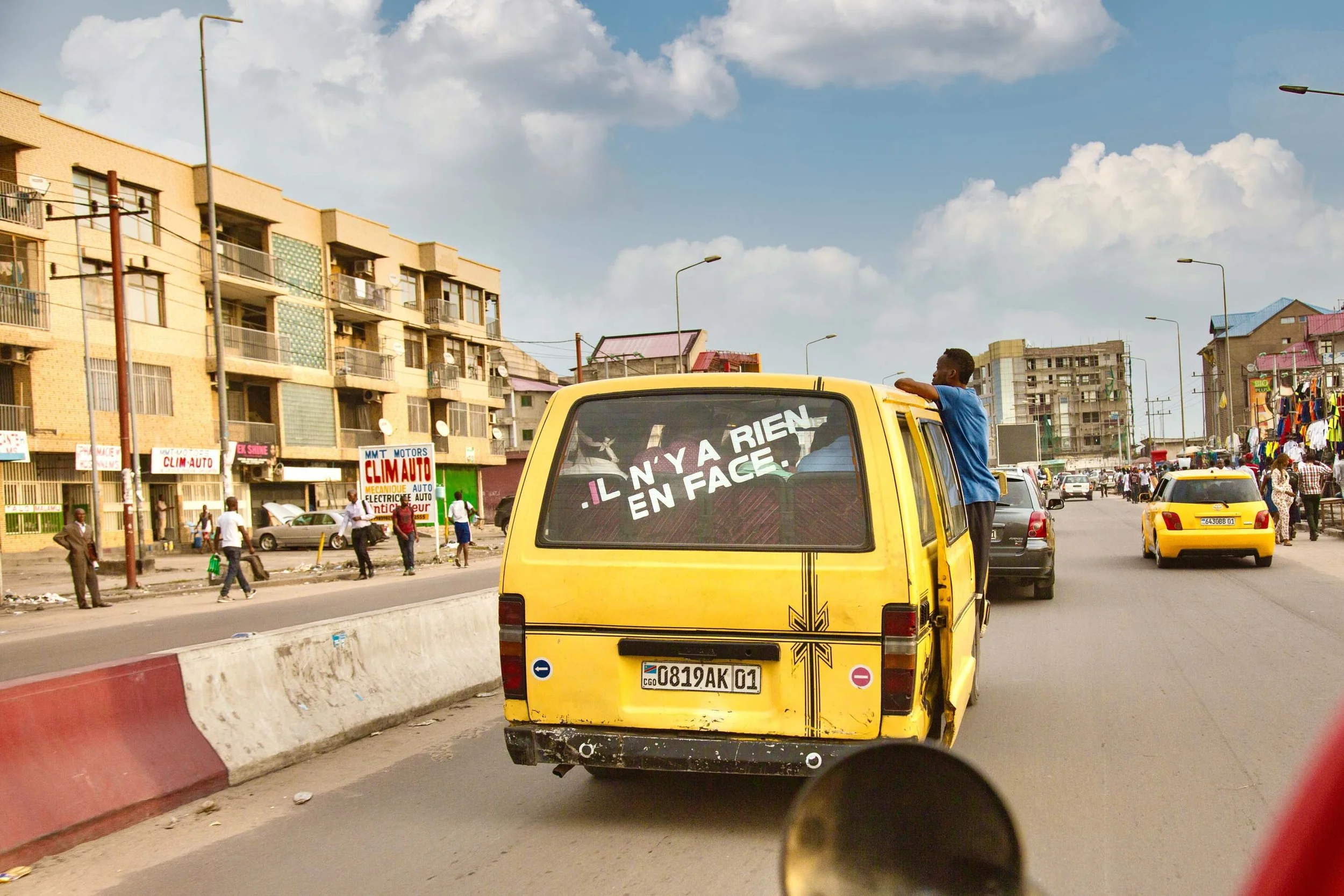 Cette série de photographies prises à la volée — souvent à l’arrière d’une moto-taxi — capture ces phrases en mouvement. Dans le contexte chaotique de Kinshasa, elles produisent parfois des illuminations fugaces. Elles deviennent poésie urbaine, graffiti roulant, mantra de fortune. Elles disent tout haut ce que la ville pense tout bas.